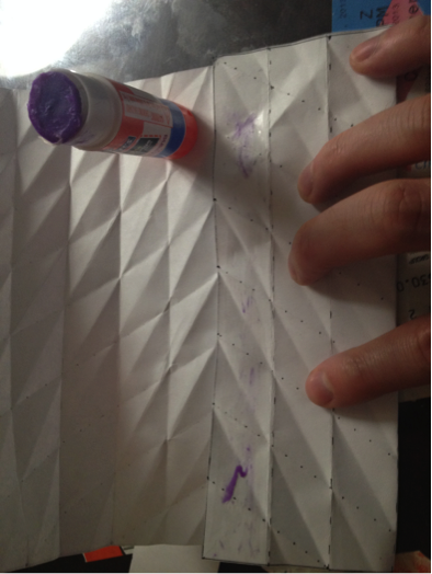 After completing the cross section of lines that would also be folded in the same direction as the horizontal lines, I focused on the final set of lines that were drawn ½ inch apart. These lines would ultimately be folded in the opposite direction of the original dotted lines.