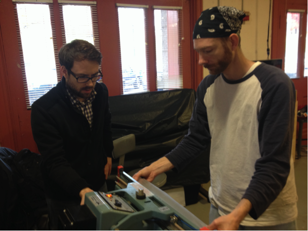 We used the heat sealer to start to connect and melt the two edges of the pattern cut out of the shower curtain material together.