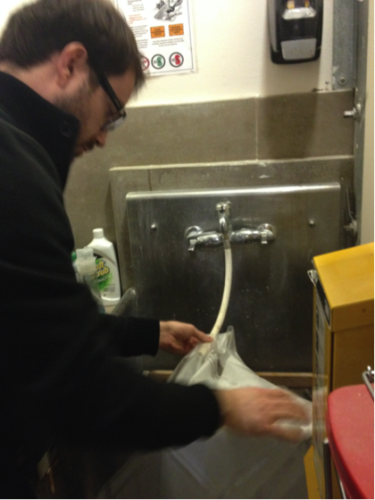 We continued to fill the vest with water in the sink until there was at least 1.5 gallons on each side.