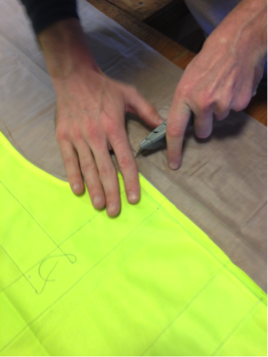 We cut out a pattern of the construction safety vest with a utility knife.